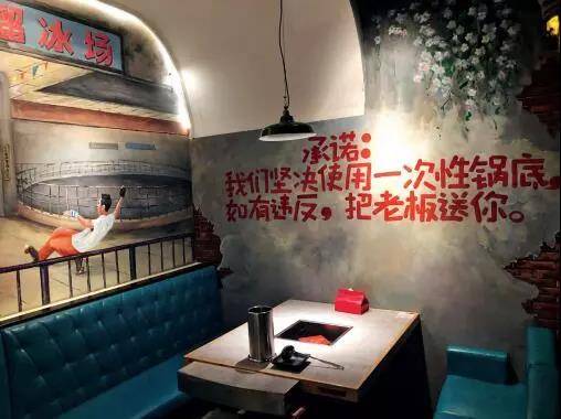 墙面装饰画都是卡通风格的戏剧人物,配合诙谐幽默的句子,让人眼前一亮。由于火锅的产品特性,在吃火锅时本来就会带给人一种红火、温暖的感觉,再结合如此个性的用餐场景,让人想不记住都难。