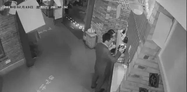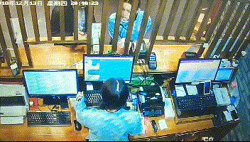 监控视频中能看出,杨某接过顾客信用卡之后并没有直接用pos机结账,而是拿到身体左侧下方做“小动作”,然后才又拿上来刷pos机。杨某不断有左手摸兜的动作,且在顾客输入密码时在旁偷看。