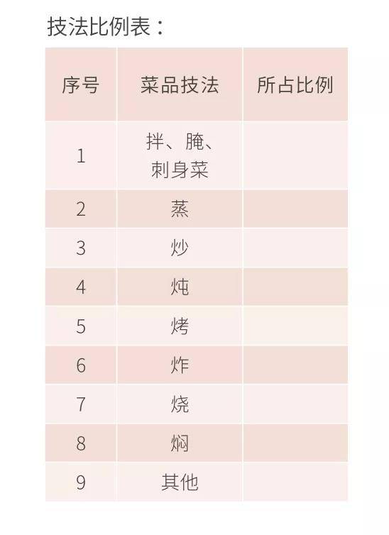 家常菜馆的话菜品无非就是五类:凉菜、面点主食、汤羹、烧炖焖煨菜和其他热菜(包括炒爆、烤、炸、煎、煮六类),依据平均点菜数,你会发现凉菜安排15款足矣,汤羹安排4款,主食安排6款,烧炖焖煨菜共安排10款,其他热菜安排20款—25款,其实足够客人点了。这些菜品加起来合计55款—60款。菜肴数量不是特别多,但是备料方便,加工起来也快捷。
