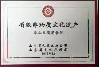 2016年,泰山豆腐宴入选山东省省级非物质文化遗产保护名录,它以泰山豆腐为主材料、重现史料记载皇家御膳的菜品,成为可供市民、游客享用的泰山特色饮食。
