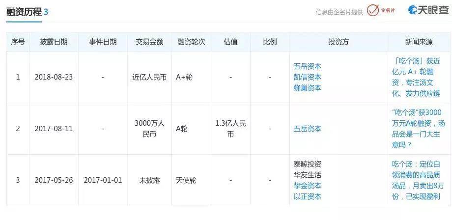2017年5月,“吃个汤”获得挚金资本、以正资本等机构的种子轮和天使轮融资,金额未披露;2017年8月,获得五岳资本3000万元的A轮融资,此时估值为1.3亿元;2018年8月,完成了近亿元的A+轮融资,投资方为老股东五岳资本,以及凯信资本和蜂巢资本。挚金资本担任独家财务顾问,而挚金资本也正是吃个汤的天使投资方之一。