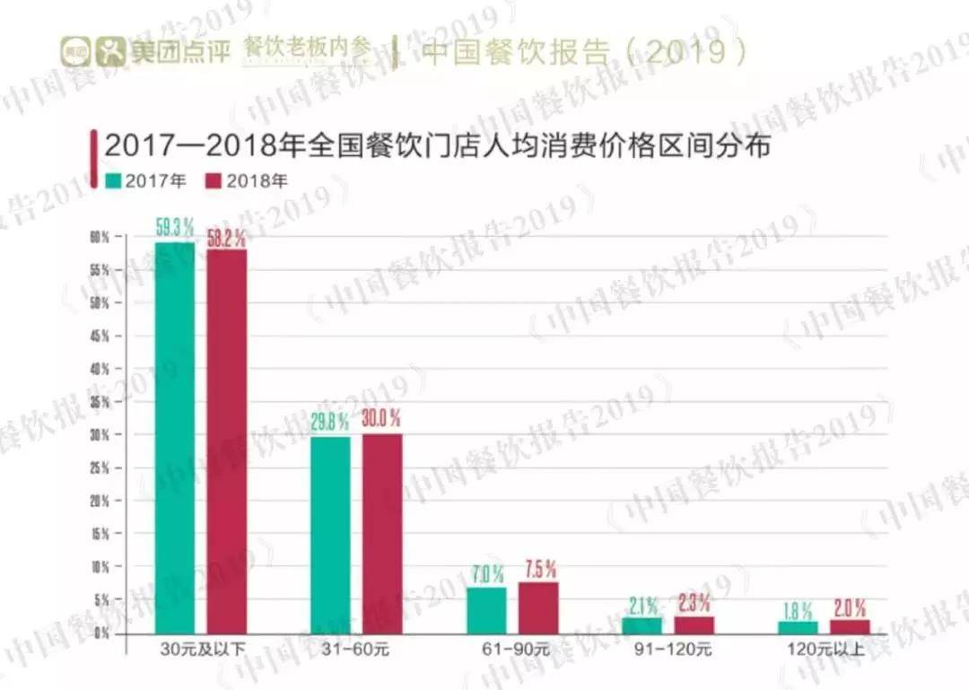 人均消费31~60元,是全国餐饮门店占比第二高的消费价格区间,2017年占比为29.8%,2018年为30.0%。