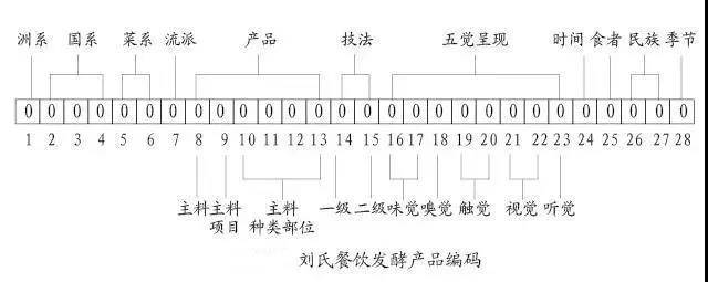 刘氏餐饮产品编码体系由28位数字组成,从空间(洲系、国系、菜系、流派)、主料、技法、五觉呈现、时间、食者、民族、季节八个维度对餐饮产品的唯一性进行界定。