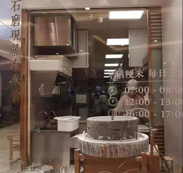 门口的大石磨是电石磨,员工只需倒入泡好的粳米,石磨自动高效快速产出米浆。