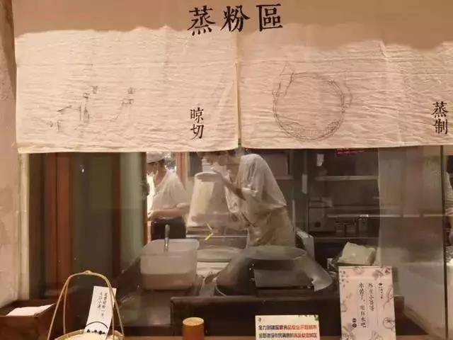 与石磨房相通的是开放式厨房。后厨手工现做,能清晰地看到员工手拿蒸板铺米浆放入蒸箱,以及员工切着热气腾腾的米粉的情景。