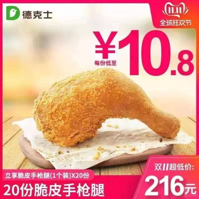 受困于场景等原因,餐饮企业大部分的“双十一”促销都是通过售卖优惠券的形式完成的。以德克士为例,天猫德克士官方旗舰店上架了脆皮手枪腿等产品的优惠,仅需216元即可获得20份手枪腿的兑换券。