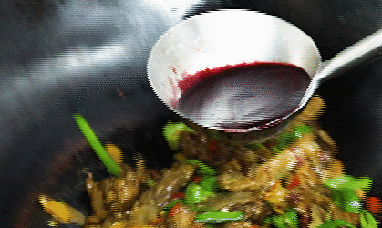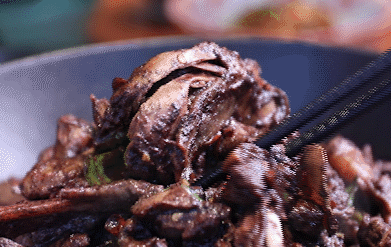 不停翻炒蘸血的鸭肉,香味浓郁。