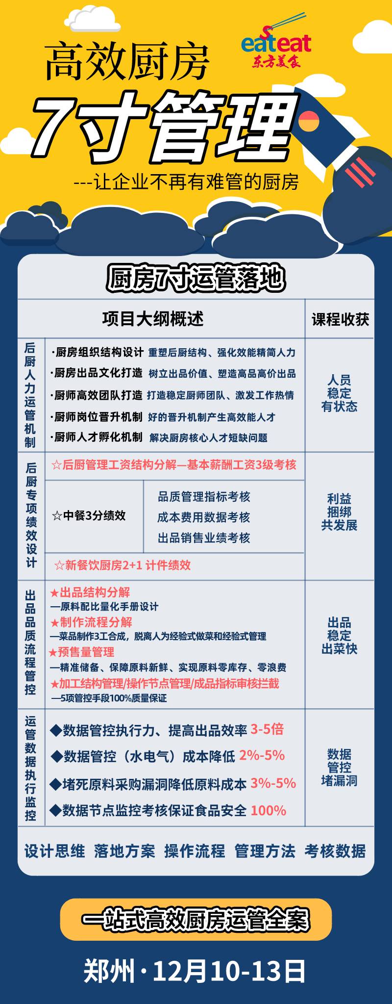 厨房人员少怎么办? 出菜速度慢怎么办? 餐前半小时还在动刀? 如何设计量化标准? 如何管控执行标准? 如何针对后厨岗位设定绩效? 如何通过精准数据管控,提高3-8%毛利? 12月10-13日郑州,