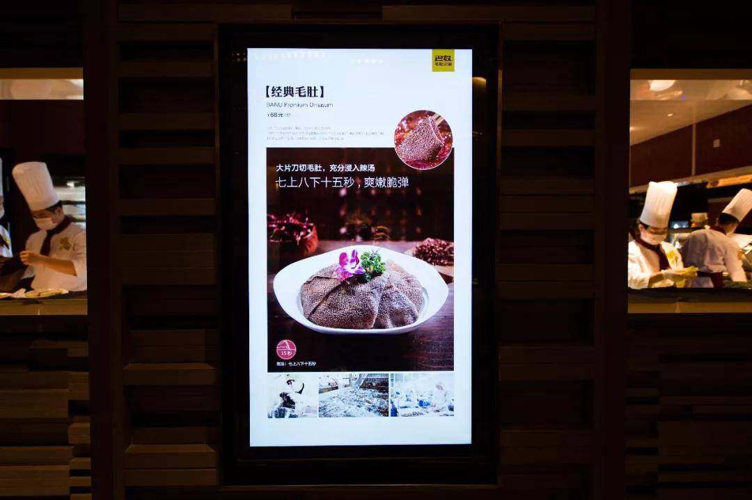 媒体面包括照片和视频,在明档的相应位置设置图片展示墙与视频屏幕。视频屏幕要循环播放菜品制作的炫技点,呈现菜品的品相;或播放菜品的“色、香、味”。邀请专业的摄影团队和视频制作团队,为自己的菜品拍摄高水准的图片与短片。比如,在毛血旺上面泼油的画面、糖醋鲤鱼浇汁的画面、食客品味美食十分陶醉的画面等等......从视觉、听觉直观地勾起顾客食欲,刺激顾客消费,降低摆档成本,减少变质。