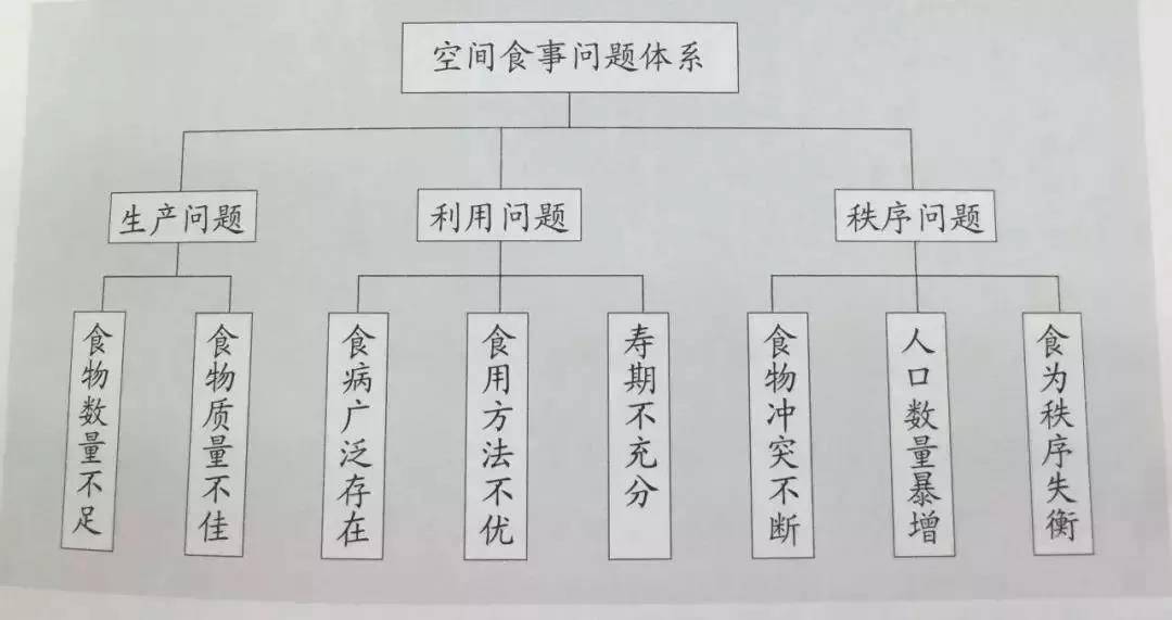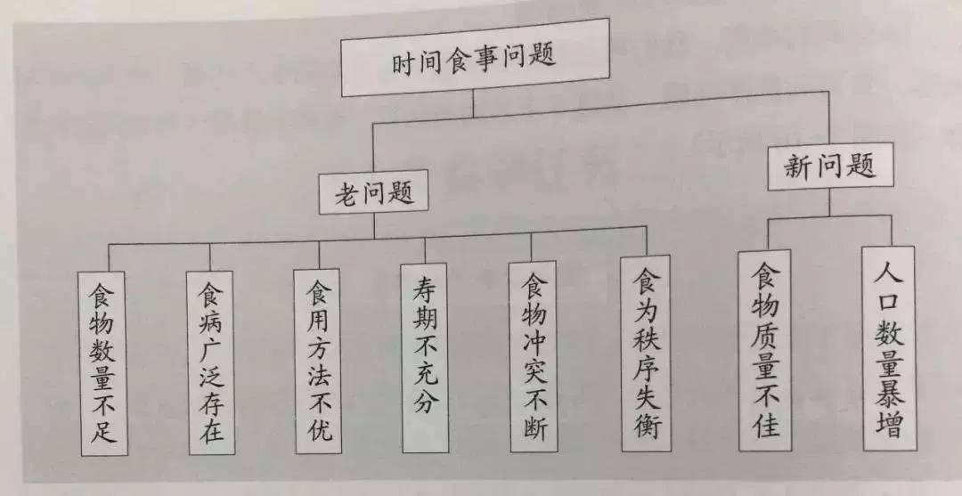 从空间角度上看,他认为食物问题分为食物的生产问题、食物的利用问题、食为的秩序问题。生产的问题,主要体现在数量、质量2个方面;利用问题主要体现在食病广泛存在、食用方法不当,寿期不充分3个方面;秩序问题主要体现在因食物引发的争端与冲突不断、人口数量暴增等方面。