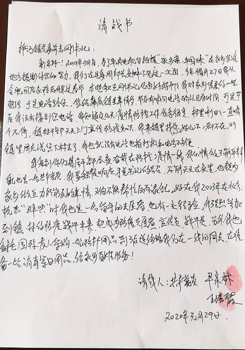 他在请战书中写道:“看到你们基层干部整夜奋斗在抗击疫情一线,我的心情久久不能平静,我是一名共产党员,我要积极响应总书记的号召,想为家乡做点力所能及的事情。”