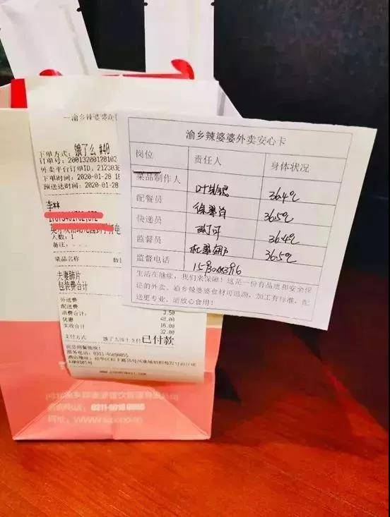 我们注意到,疫情之下,餐企的外卖订单上,都特地增加了一张安心卡,标注有菜品制作人、配餐员、快递员和监督员等岗位的责任人和体温状况,通过这种形式,让企业吃的安心、放心。