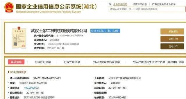 武汉土家二妹餐饮服务有限公司成立于2016年11月14日,经营范围包括餐饮服务;预包装食品兼散装食品、蔬菜、水果、初级农产品、百货、日用品网上批零兼营。