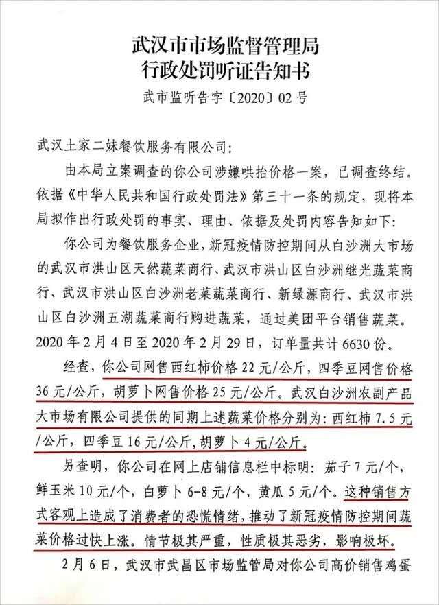 3月3日,湖北省武汉市市场监督管理局发出行政处罚听证告知书,拟对武汉土家二妹餐饮服务有限公司哄抬价格违法行为,依据《中华人民共和国价格法》《价格违法行为行政处罚规定》等法律法规规定,“顶格”罚款300万元。