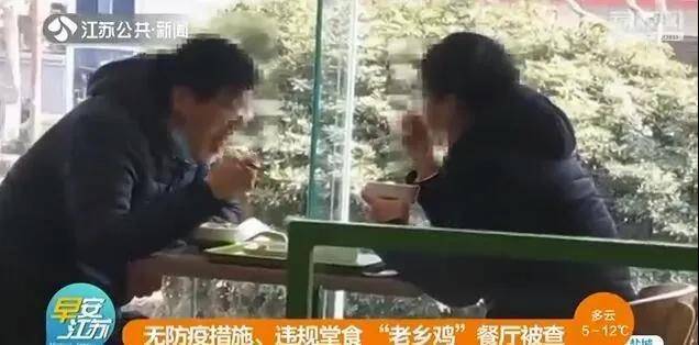 3月5日中午十二点多,在"老乡鸡"餐厅南京三山街店门口,透过玻璃窗就可以看到,几位顾客正面对面坐着吃饭,彼此间距离很近。甚至有三四个人围坐就餐的现象。