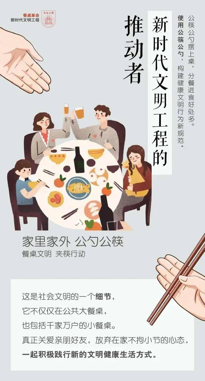 让我们一起努力共同参与,倡议发起新时代文明工程公益活动“餐桌革命 公筷行动”。“文明不文明,餐桌最要命”,让文明健康新理念深入千家万户,人人养成文明健康饮食好习惯!