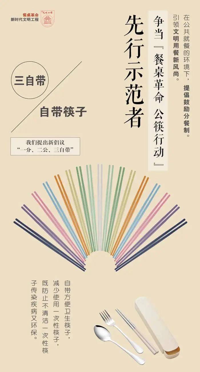 在单位订购外卖快餐和家庭朋友结伴外出游玩,自带方便卫生筷子,减少使用一次性筷子,既防止不清洁一次性筷子传染疾病又环保,每个人每餐饭每一个环节都争当“餐桌革命 公筷行动”的先行示范者。