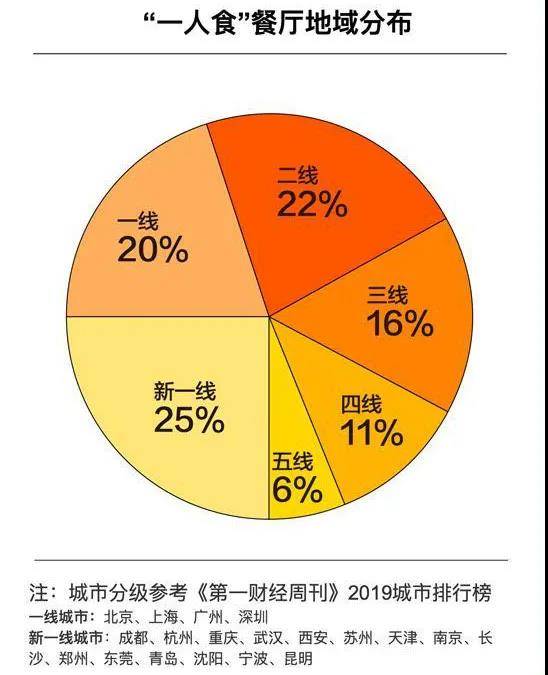 值得注意的是,新一线和二线城市由于城市数量和经济体量的综合优势,“一人食”餐厅分布数量占比分别达到25%和22%,均高于一线城市的20%。数量对比的差异性,也在一定程度上反映出“一人食”餐厅的下沉趋势。