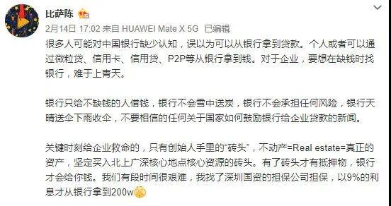 在关键时刻给企业救命的,只有创始人手里的‘砖头’,不动产=Real estate=真正的资产,坚定买入北上广深核心地点核心资源的砖头。有了砖头才有抵押物,银行才会给你钱。