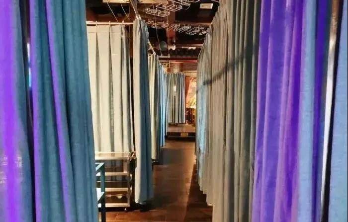 “店内所有布帘加起来面积超过600平方米。”该店总经理聂少文表示,这一创意是受医院启发。“我们无意中想到医院用隔帘隔离床位,之后就朝着这个方向寻找合适的帘子。我们店主打复古风,选用蓝色会贴心一点。从选择厂家量身订制布帘和不锈钢架,到最后安装,用了一周时间。”