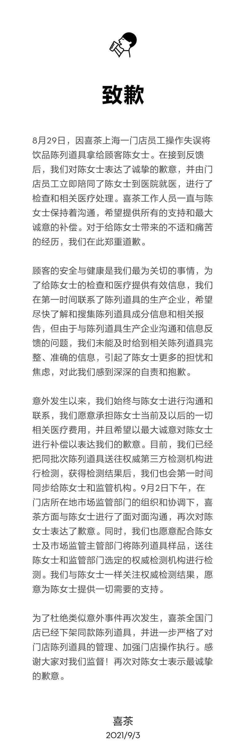 8月29日,因喜茶上海一门店员工操作失误将饮品陈列道具拿给顾客陈女士。在接到反馈后,我们对陈女士表达了诚挚的歉意,并由门店员工立即陪同了陈女士到医院就医,进行了检查和相关医疗处理。喜茶工作人员一直与陈女士保持着沟通,希望提供所有的支持和最大诚意的补偿。对于给陈女士带来的不适和痛苦的经历,我们在此郑重道歉。