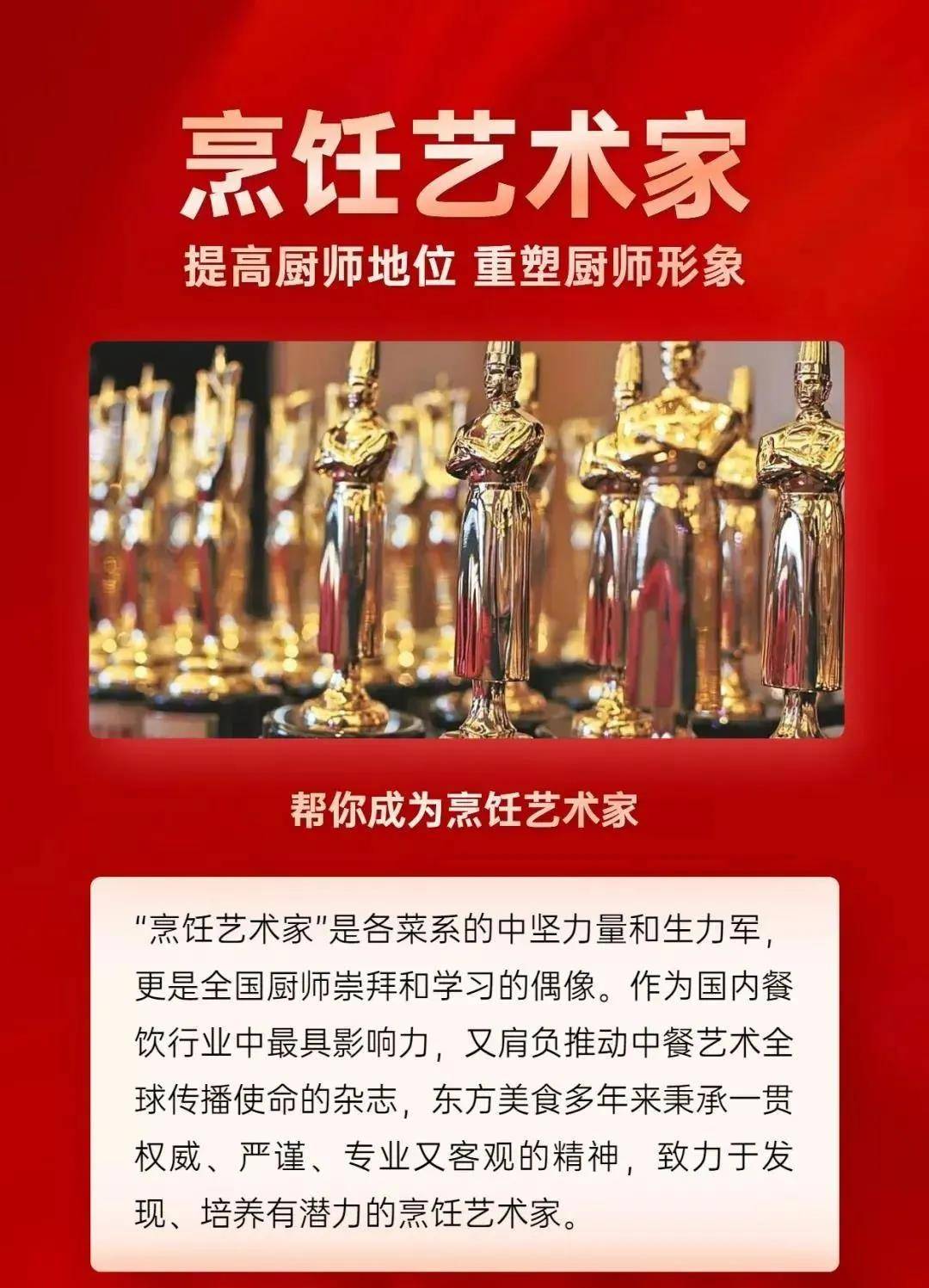 为提高厨师地位、重塑厨师形象,东方美食创始人刘广伟于1992年首次提出“烹饪艺术家”概念。1993年将“帮助厨师成为烹饪艺术家”当作自己的梦想:创办《烹饪艺术家》杂志,举办了九届烹饪艺术家国际大赛和七届烹饪艺术家年会,至今已有近千位烹饪艺术家获颁金像奖。