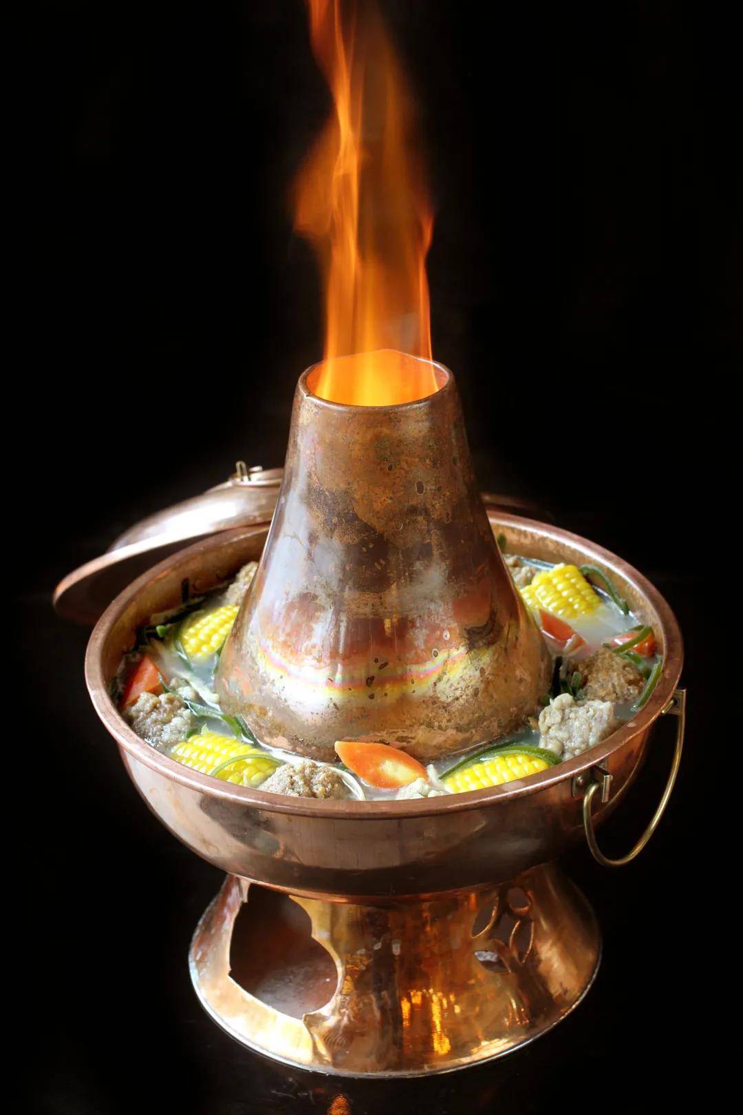 我综合了四川各地土火锅的特点,决定还是沿用易采购、省成本的加炭铜火锅,并设计本地人爱吃的肉糕、芋头、玉米、酥肉、丸子、海带、木耳、玉兰片、胡萝卜做主料,荤素各半,加入鸡汤,用炭火慢煨1小时,因这口锅中的汤汁一直不沸腾,而是保持鱼眼泡的状态持续加热,上桌后鲜味不会流失。