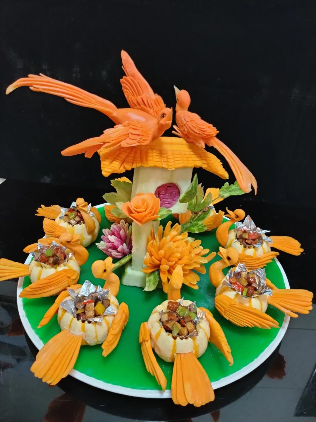 塞北鸟鸣巧妙地用陕北杂粮面粉做成一个笼罩,里边则用虾仁与鸡蛋清做成几只可爱的小鸟。塞外鸭趣是用陕北小金瓜雕刻成小鸭子,里面放入鸭肉、白灵菇作为馅料,活灵活现、诱人食欲。后来他把这两款获奖菜在酒店经营,效果十分显著,很受顾客欢迎。