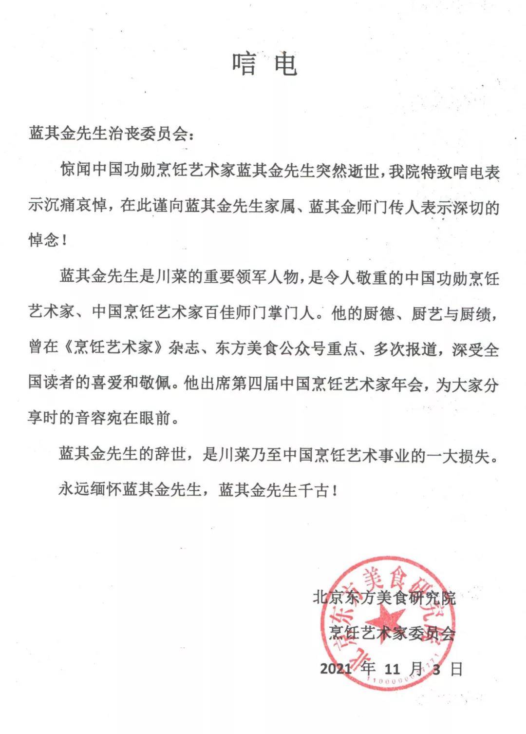 2021年11月3日,烹饪艺术家委员会收到通知,我们尊敬和喜爱的中国功勋烹饪艺术家、中国烹饪艺术百佳师门掌门人蓝其金先生,于2021年11月3日上午8点15分因病逝世,享年76岁。