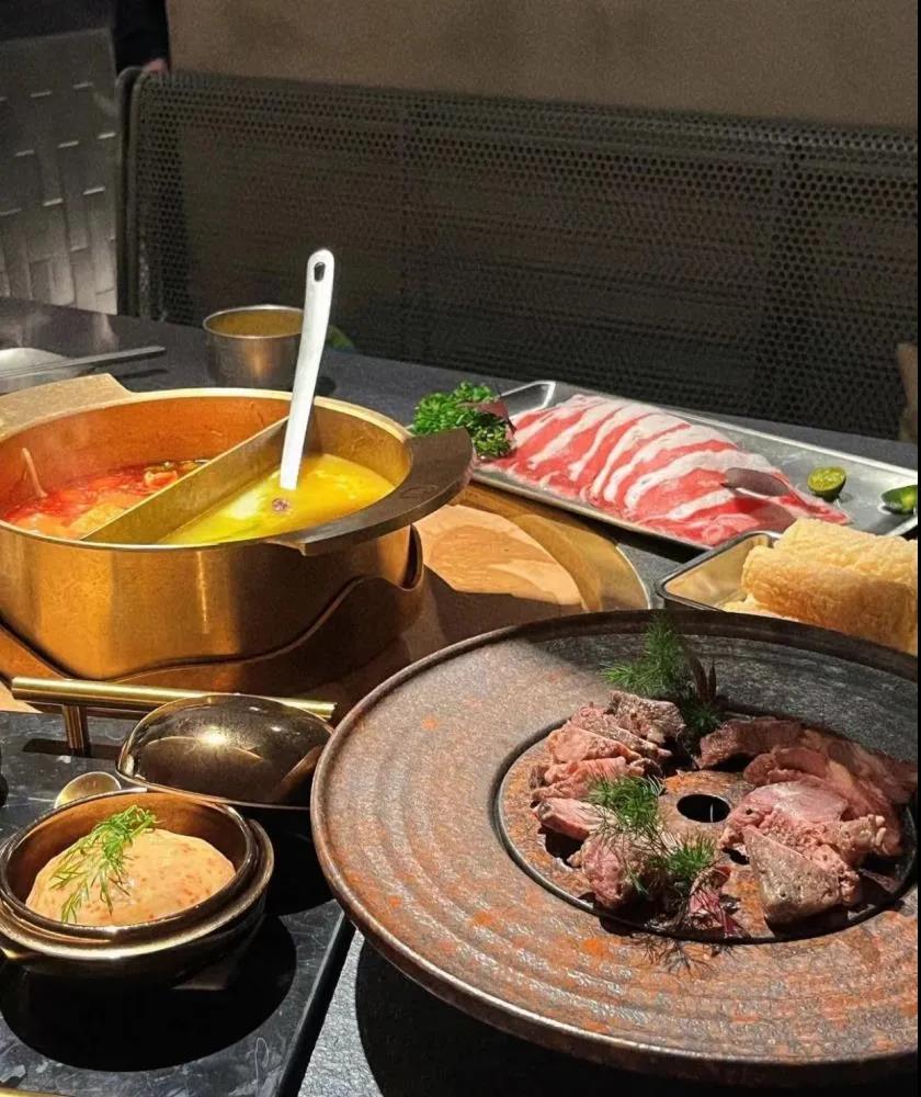 餐桌上是铜铸的“火山锅”,外圈金属盘可以烧烤,中间两格涮火锅。火锅盘兼具烤肉功能,是“涮烤饮”新组合,一锅两吃。
