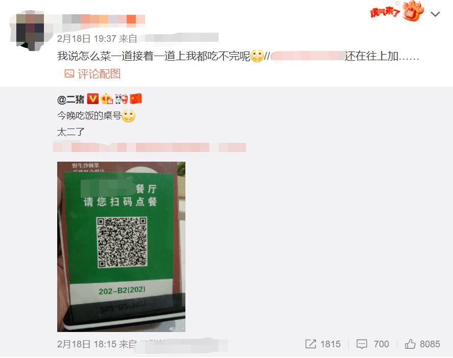 2月18日晚上6时左右,有博主“二猪”在网上晒出其晚餐点单的二维码,“今晚吃饭的桌号,太二了。”该微博的配图为北京基辅罗斯餐厅的点餐二维码,桌号有多个数字是2。