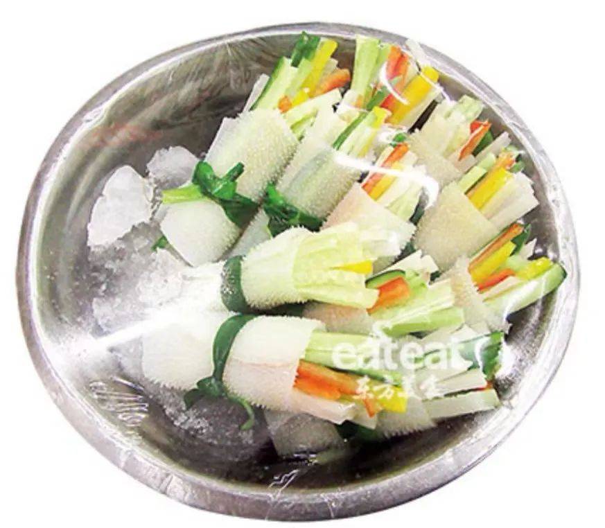 1. 将百叶110克改刀成整齐的大片;马踏湖脆藕、荷兰瓜各65克切丝;黄、红彩椒各8克切丝;