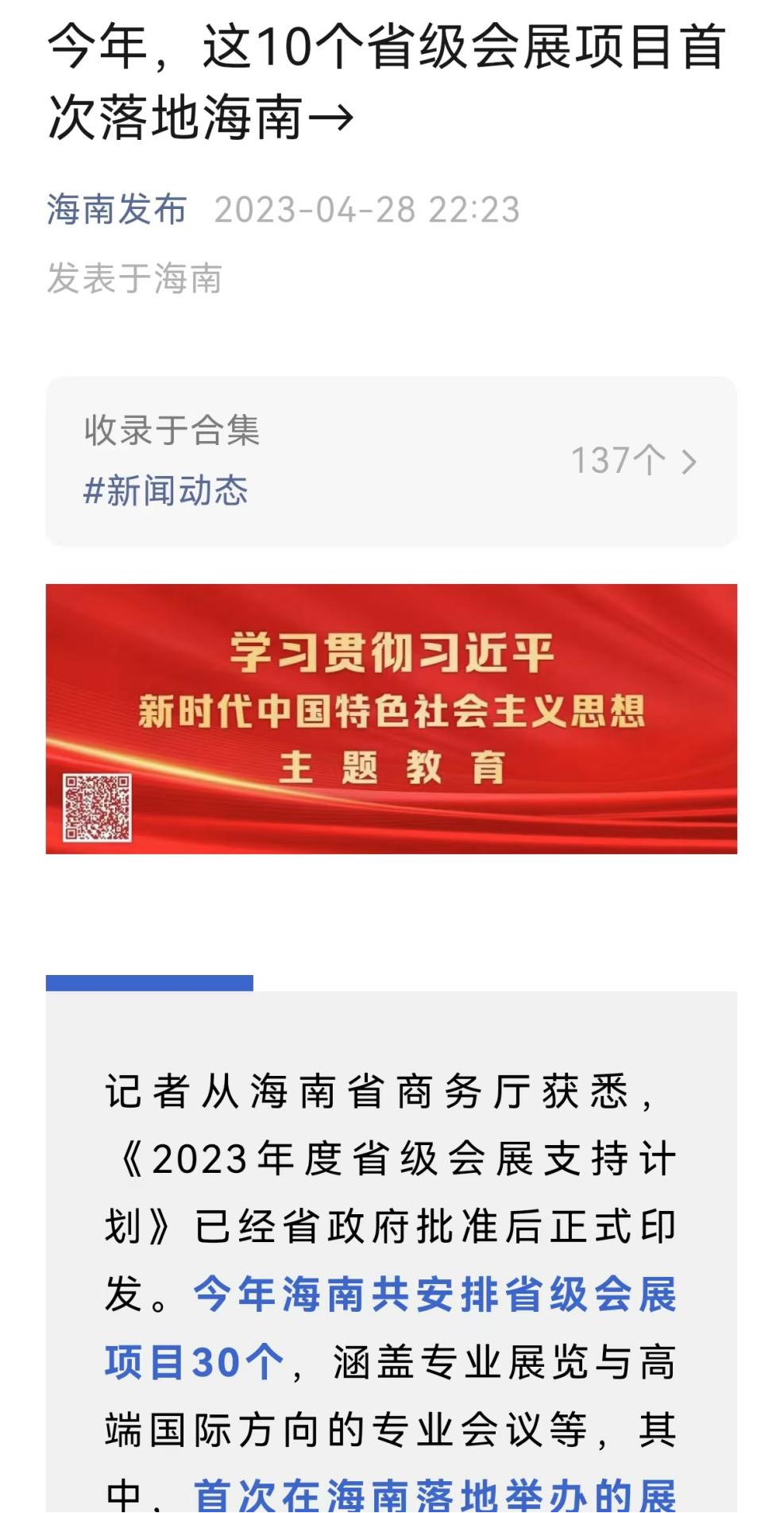 海南省政府近日发布《2023年度省级会展支持计划》,其中,首次在海南举办的高端国际专业会议8个。