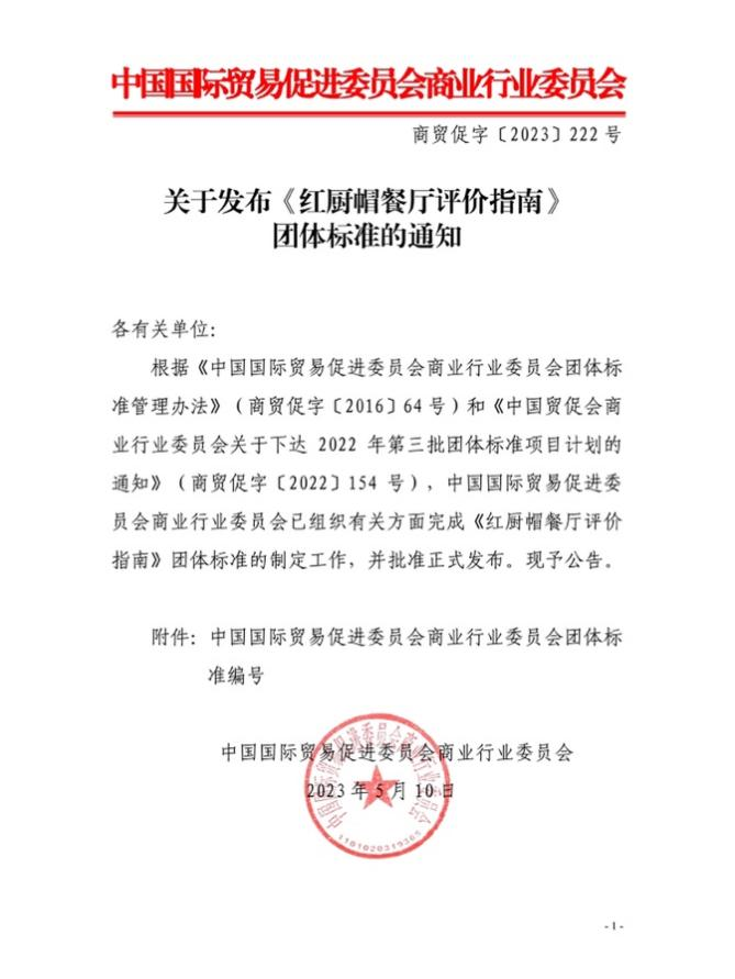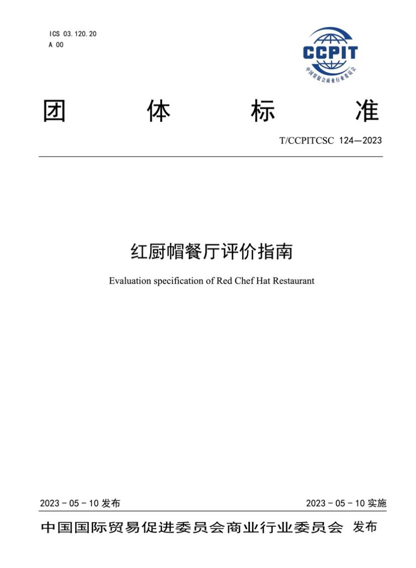 2023年5月10日,由北京东方美食研究院提出,联合国内十多家知名相关单位共同起草,由中国国际贸易促进委员会商业行业委员会归口的《红厨帽餐厅评价指南》团体标准正式发布。