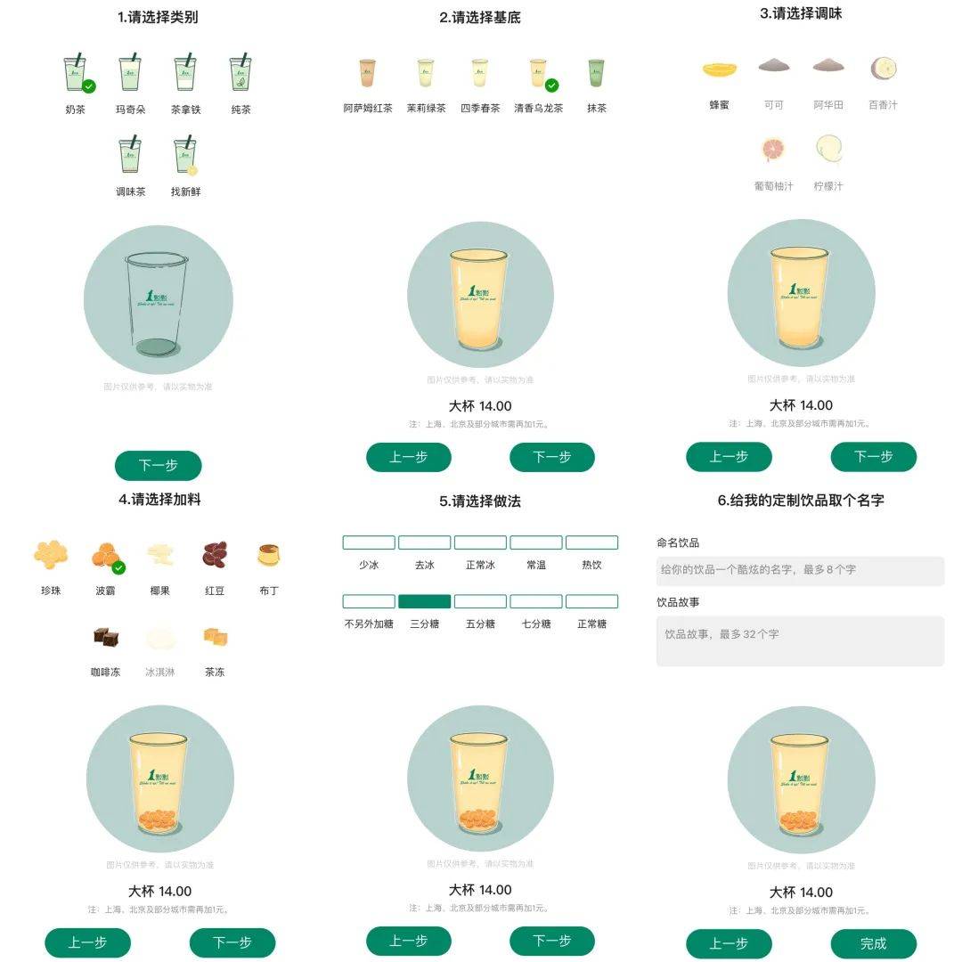定制我的饮品从选择类别开始,类别有六种:奶茶、玛奇朵、茶拿铁、纯茶、调味茶、找新鲜,大概是为了使大家方便制作,这些与小程序点单的分类略有不同。以小编选的奶茶为例,接着需要挑选自己想要的基底再加入小料,在做法里选合适的温度与想要的甜度一杯“定制奶茶”就基本成形了。
