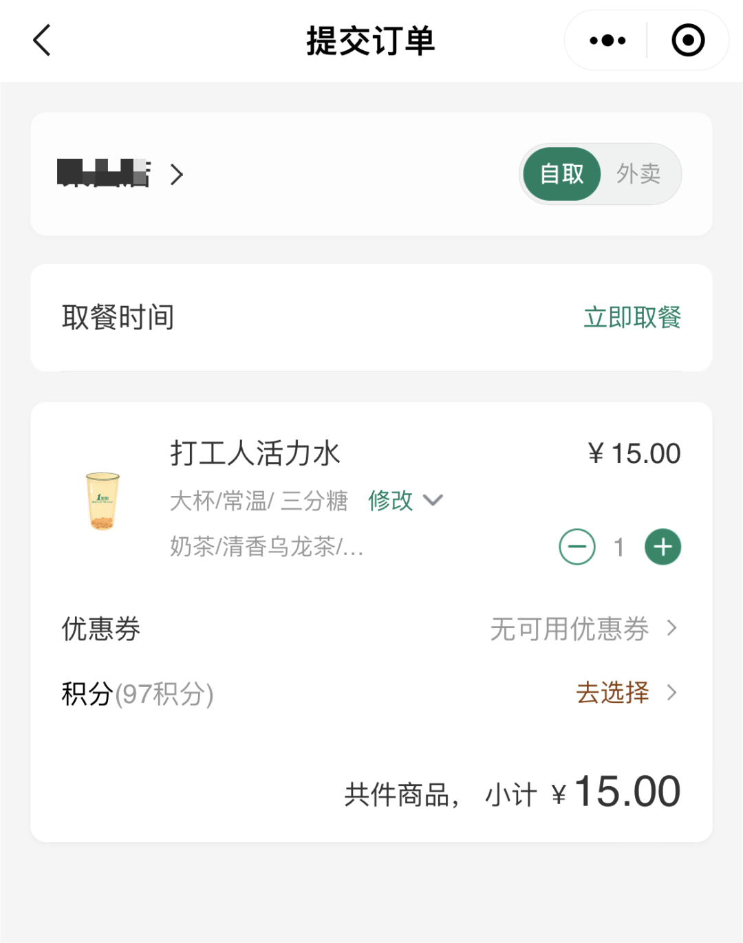 下面就来到了比较灵魂的步骤——给自己的奶茶命名以及赋予它一个故事,当这一番行云流水的操作结束后这杯“定制奶茶”就会出现在我们的店铺首页里了,此刻可以进行购买,小程序会自动跳转并且将“定制奶茶”添加进购物车中。后续选择门店,自提还是外卖的流程就与常规下单无异了,不得不说整体衔接的还是比较流畅丝滑的。