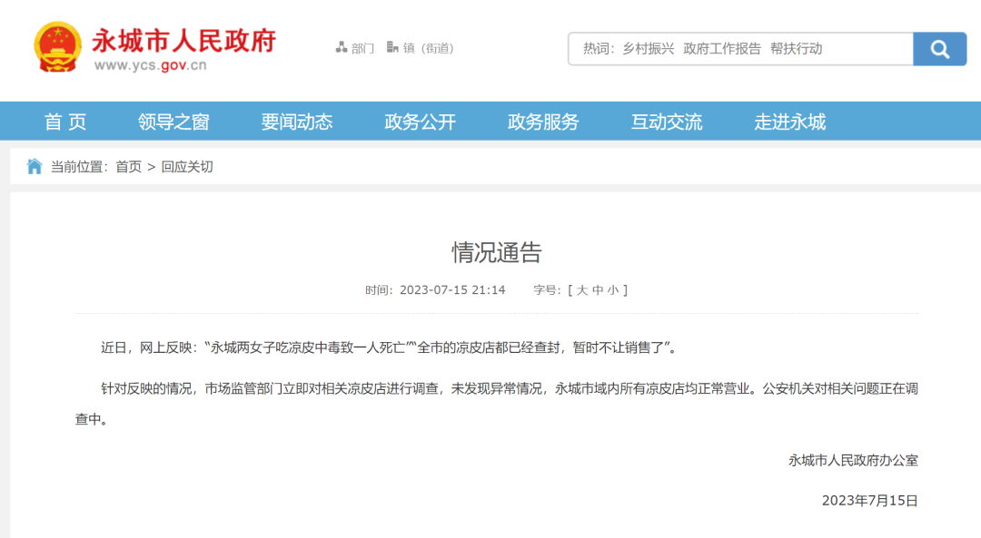 事情发生后,永城市市场监督管理局也对全市凉皮企业进行了抽检,未发现任何问题,当地公安也已经介入。目前,关于停止售卖凉皮的事情,相关单位也已经发布公告:“永城市域内所有凉皮均正常营业。”后续有新情况将再公布。