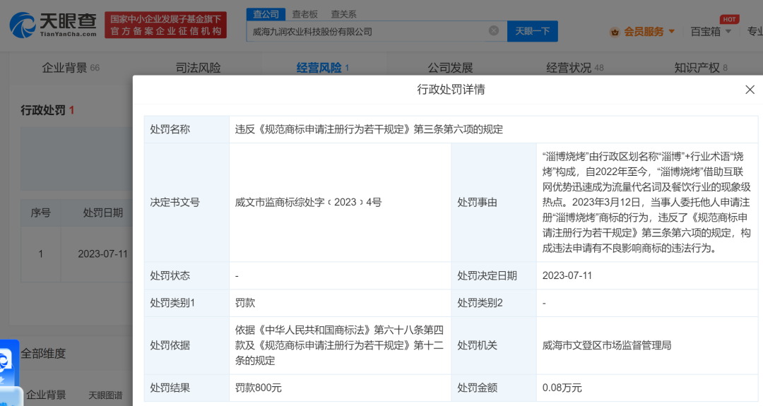 据了解,处罚事由显示,“淄博烧烤”由行政区划名称“淄博”+行业术语“烧烤”构成,自2022年至今,“淄博烧烤”借助互联网优势迅速成为流量代名词及餐饮行业的现象级热点。2023年3月12日,当事人委托他人申请注册“淄博烧烤”商标的行为,构成违法申请有不良影响商标的违法行为。