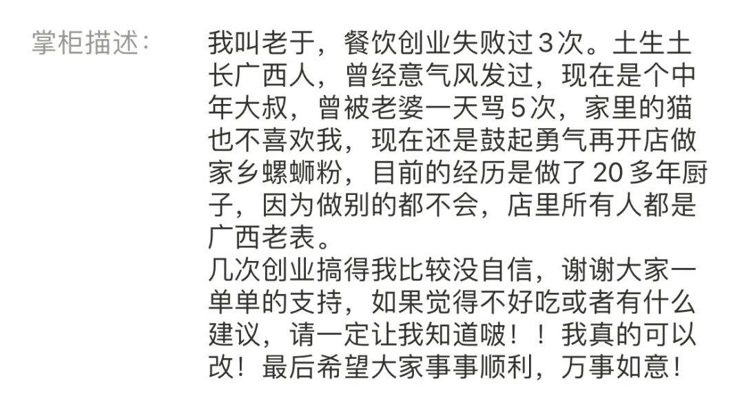 “人到中年创业失败过3次,曾被老婆一天骂5次,家里的猫也不喜欢我,但还是鼓起勇气再开店做家乡螺蛳粉”“我做了20多年厨子,因为做别的都不会,几次创业让我比较没自信,谢谢大家的支持,如果觉得不好吃或有建议,请一定让我知道!我真的可以改!”