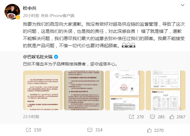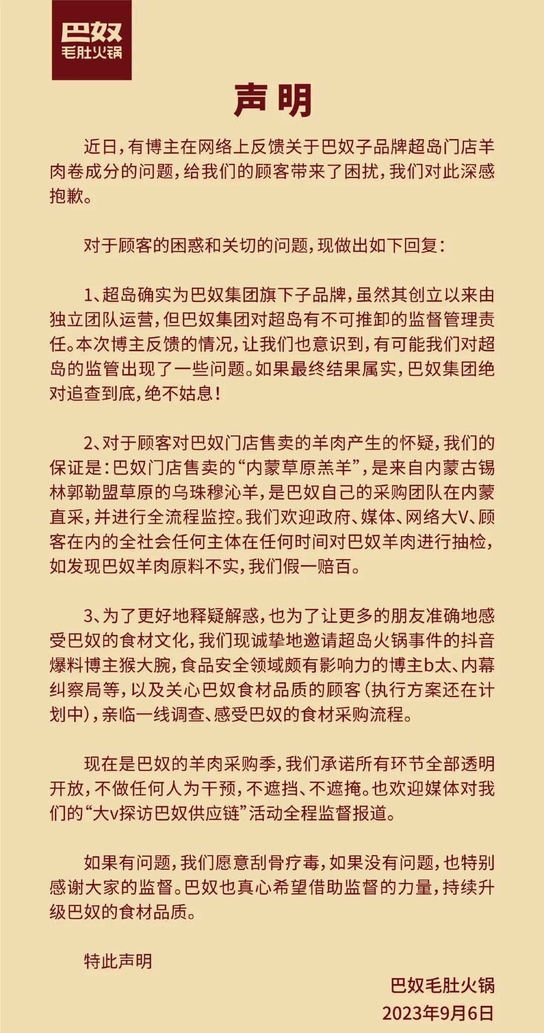 随后官方渠道发布公告称:“巴奴注意到网络有关子品牌超岛门店“羊肉卷成分问题”的舆论后,要求超岛团队主动送检,最新报告结果显示,羊肉卷确实含有鸭肉成分。”巴奴毛肚火锅创始人杜中兵在微博发文道歉,表示会尽最大的诚意去弥补信任过巴奴毛肚火锅的顾客。