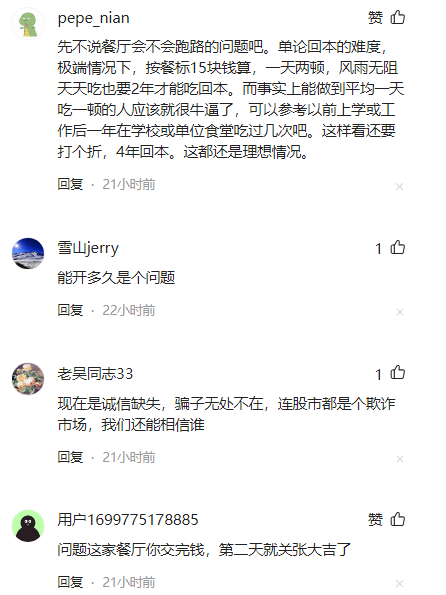 有人认为尽管终身免费用餐的提议看起来诱人,但有可能像一些健身房、美容院充值后老板会跑路那样,等到达到一定充值额后餐厅老板也会跑路。另一个值得考虑的问题是,即便不跑路,但餐厅能否长期维持这个会员制度?经营一家餐厅本身就是一项挑战,如果无法持续盈利,那么最终也会影响到会员权益。