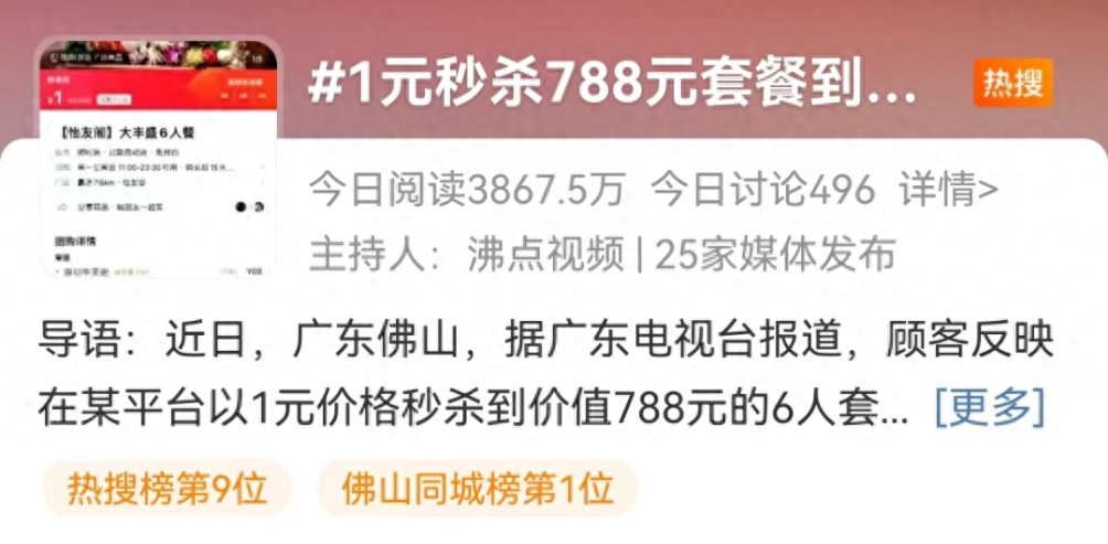 近日,有消费者反映,自己在某平台以1元价格秒杀到了价值788元的6人套餐,在规定时间内到店消费时,却遭到了店家的拒绝。当事人陈先生表示:“店员说套餐是亏本的,没办法核销,就让我们走。”消息一出立即引发了大量的讨论。
