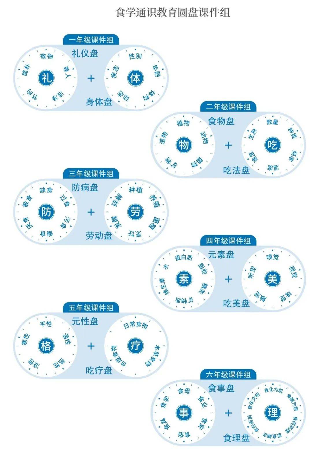 食学通识教育圆盘课件由 12 个圆盘 64 个刻度组成。12 个圆盘分别是礼仪盘、身体盘、食物盘、吃法盘、防病盘、劳动盘、元素盘、吃美盘、元性盘、吃疗盘、食事盘和食理盘,由浅入深,由表及里、逐步深入地为中小学生详细讲解了是食物的分类、食物的成分、吃饭的方法以及食事的原理。