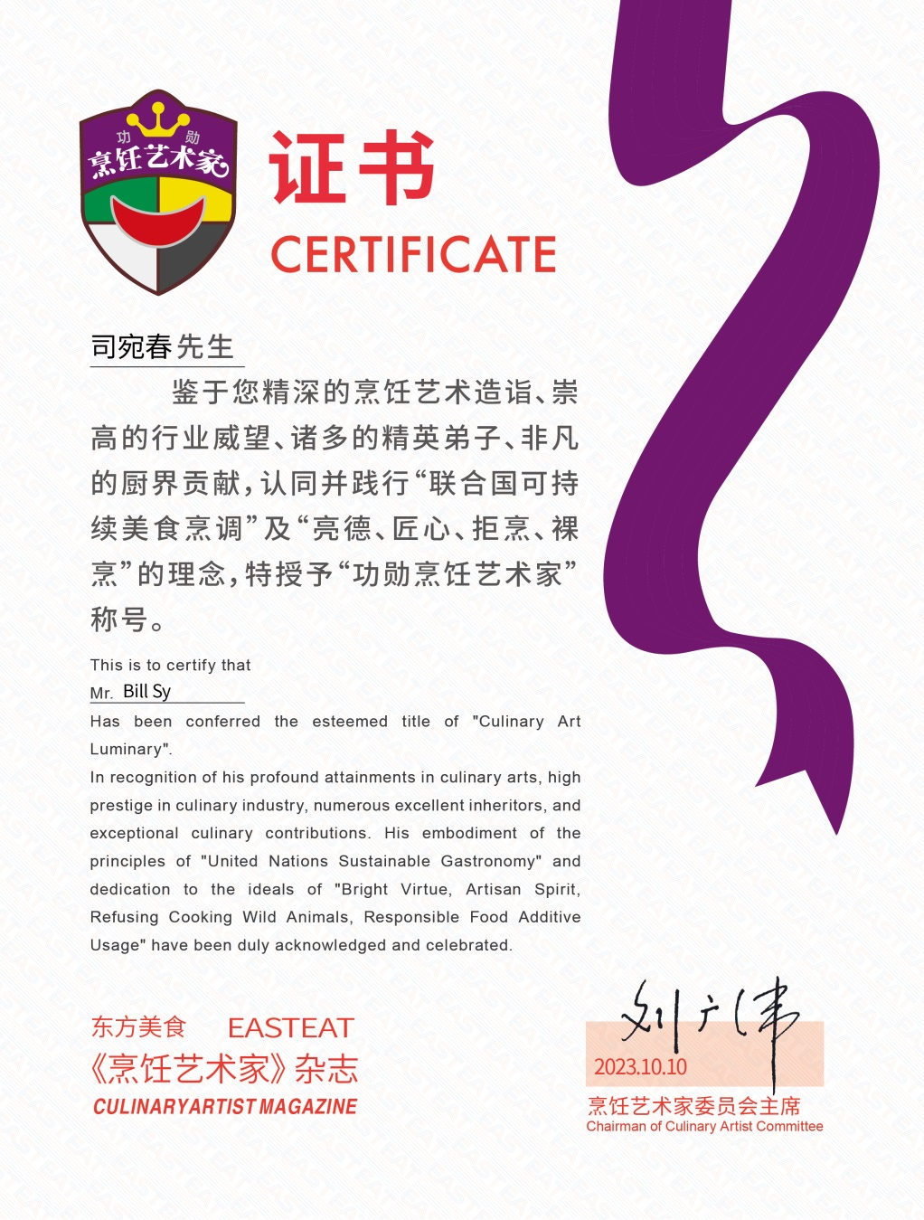 恭喜Bill.SY(司宛春)先生获得本届“功勋烹饪艺术家”。