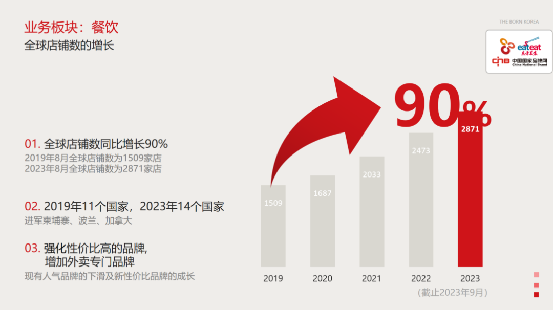 得本集团2019-2022年营收及净利润,未受疫情余波影响,持续增长。其中餐饮店铺数的增长,全球店铺数同比增长90%,2019年8月全球店铺数为1509家店,2023年8月全球店铺数为2871家。2019年11个国家,2023年14个国家。强化性价比高的品牌,增加外卖专门品牌。