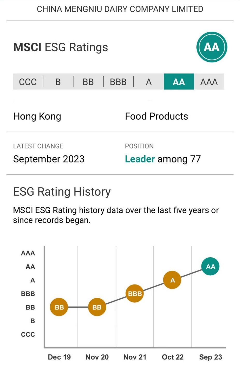 蒙牛与上下游伙伴的努力,得到了国内外权威机构的认可。蒙牛已连续3年蝉联“恒生可持续发展企业指数成分股”,位列国资委“央企ESG·先锋100指数”第三名,被标普全球评为“行业最佳进步企业”。就在不久前,蒙牛在MSCI ESG评级中获评AA,不但成为中国唯一一家取得“AA”评级的综合型乳制品企业,也在所有77家参评同业企业中位居“领导者”水平。