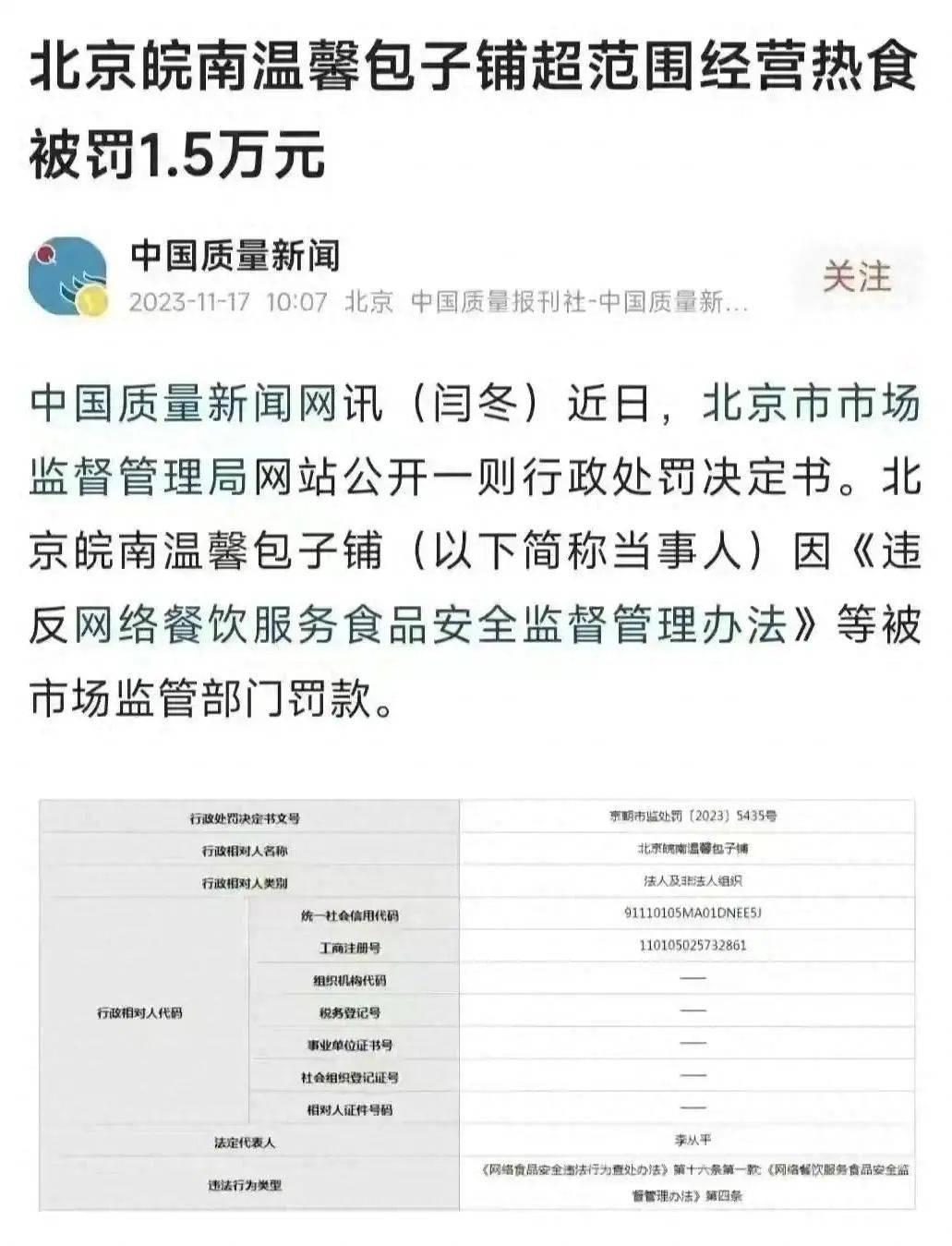 据了解,这家被处罚的包子铺位于北京,在2022年04月23日至2023年07月27日期间,北京皖南温馨包子铺在美团外卖平台超过许可的经营项目范围经营热食类食品。