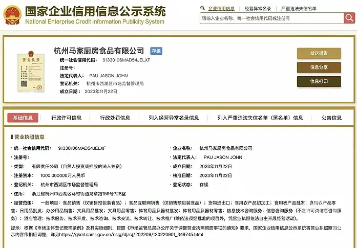 “马家厨房”的成立引起了大众的热议。据了解,杭州马家厨房食品有限公司在11月22日注册成立,法定代表人为PAU JASON JOHN,注册资本1000万元,经营范围含食品销售(仅销售预包装食品)、货物进出口、食用农产品批发、日用品批发、酒店管理、技术服务等。