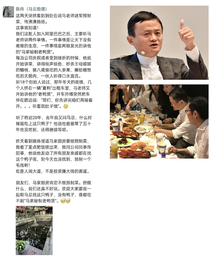 但是马云前助理陈伟针对这一传闻在朋友圈发文进行了澄清。陈伟表示:“马家厨房肯定不做预制菜。但做什么,我们还真不好说。”