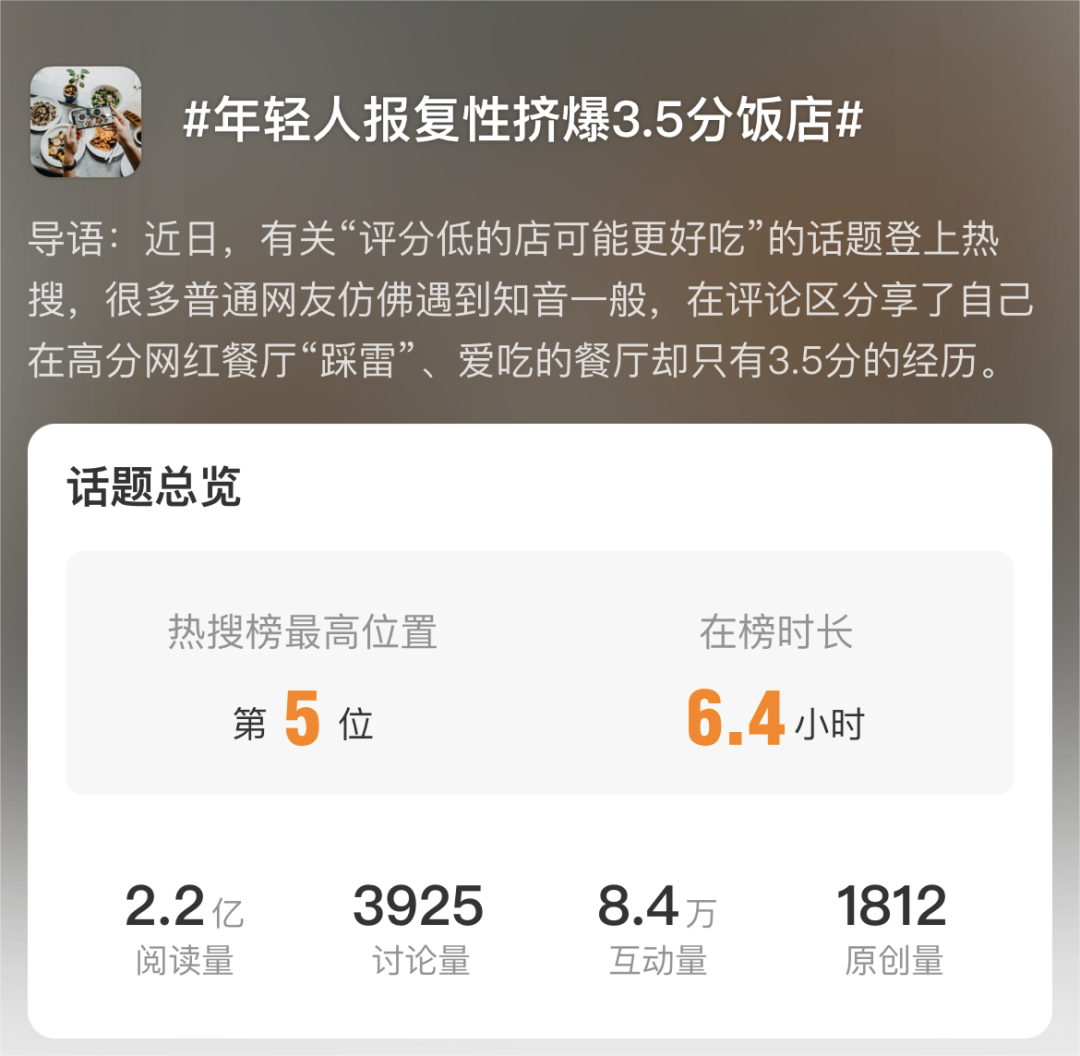 12月中旬,一场关于“年轻人报复性挤爆3.5分饭店”的讨论在网络上展开,许多网友纷纷表示,相信评分不如相信自己的舌头,随即此话题也顺势登上热搜,共有2.2亿的阅读量。就这样,支持低分饭店的风潮袭来,#评分低的饭店 好吃#的话题因大家热议而登上热搜。